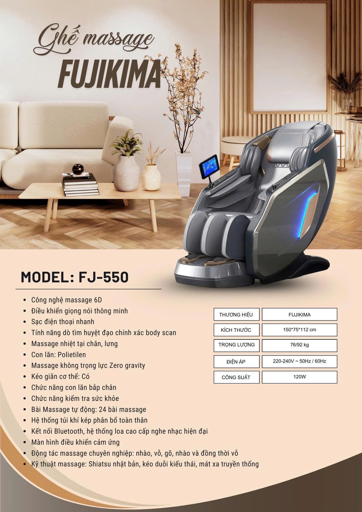 Ghế massage cao cấp Fujikima FJ- 550 (HT-799) là dòng ghế massage được ứng dụng công nghệ Nhật Bản, với nhiều công nghệ nổi bật giúp mang lại cảm giác massage chân thực cho người dùng như: Công nghệ AI, 6D, Scan Body,… Với 24 bài tập tích hợp sẵn cùng màn hình cảm ứng LCD dễ dàng sử dụng cho người cao tuổi, nhân viên văn phòng, các vận động viên,…