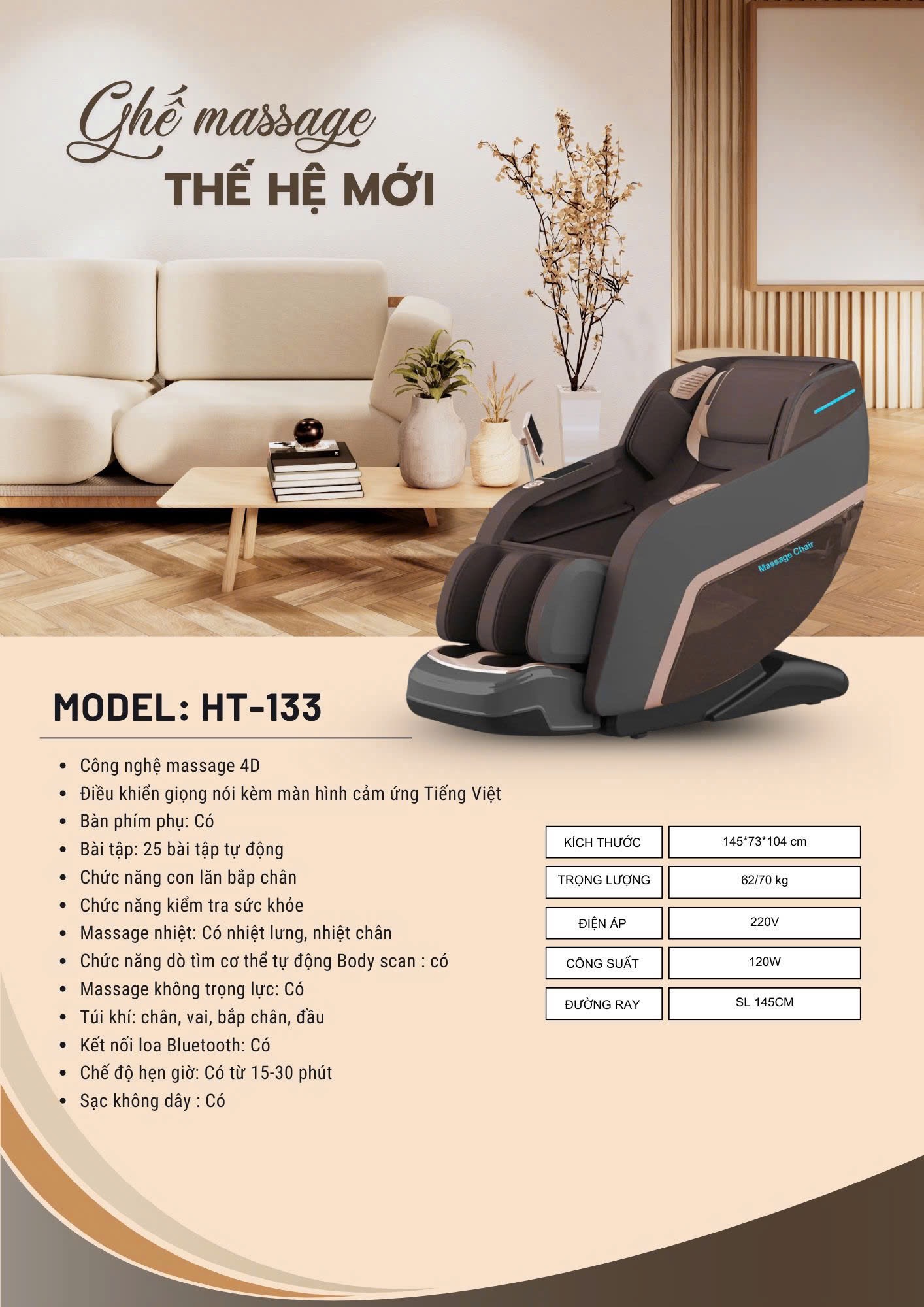 Ghế massage cao cấp HT-133 là dòng ghế massage được ứng dụng công nghệ Nhật Bản, với nhiều công nghệ nổi bật giúp mang lại cảm giác massage chân thực cho người dùng như: Công nghệ AI, 4D, Scan Body,… Với 25 bài tập tích hợp sẵn cùng màn hình cảm ứng dễ dàng sử dụng cho người cao tuổi, nhân viên văn phòng, các vận động viên,…