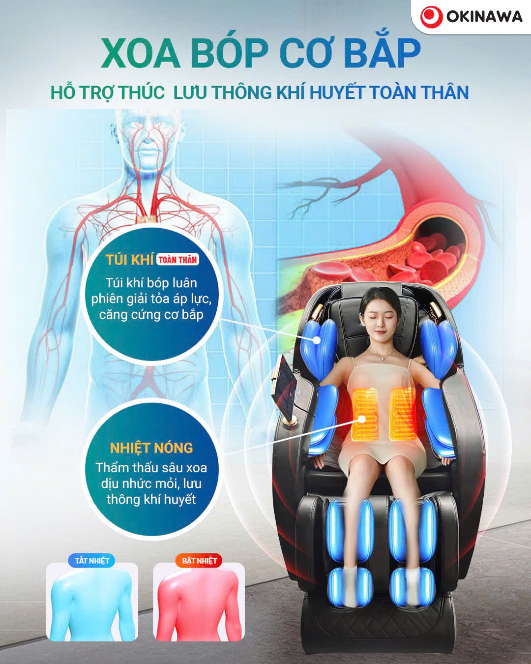 ✔ Chăm sóc sức khỏe toàn diện: Công nghệ nhiệt nóng hỗ trợ trị liệu, tăng cường tuần hoàn máu, xoa dịu những cơn đau mỏi vùng lưng và hông hiệu quả. Hệ thống túi khí toàn thân bố trí tại các vị trí trọng yếu trên cơ thể, nhẹ nhàng xoa bóp, giảm tê bì cơ bắp.