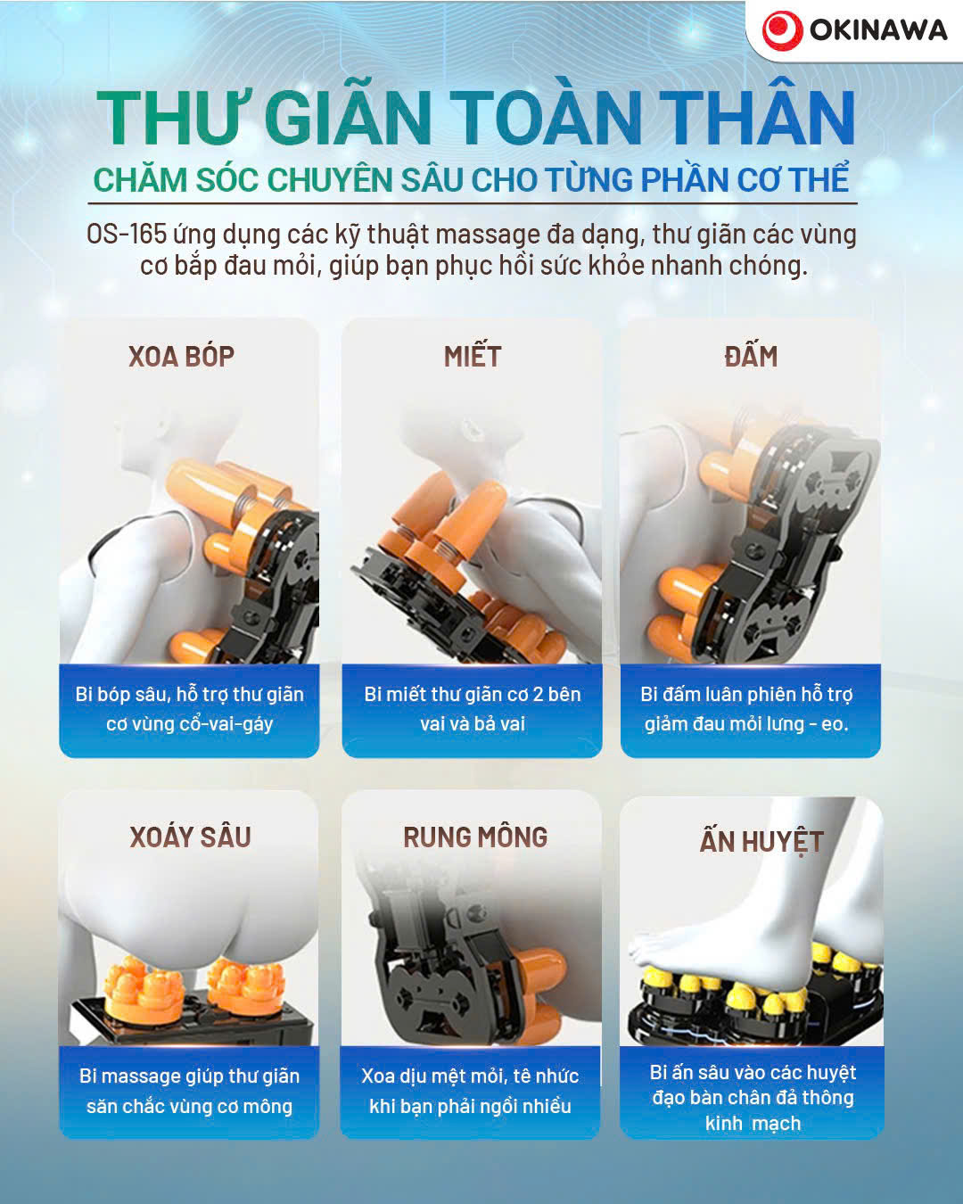 Hệ thống túi khí – Ôm trọn cơ thể, nâng niu từng giác quan: Okinawa OS-165 được trang bị hệ thống túi khí hiện đại, với số lượng lớn và chất lượng vượt trội. Các túi khí được bố trí khoa học, bao bọc toàn bộ cơ thể, ôm sát từng đường cong, mang đến cảm giác êm ái và thư giãn tuyệt đối. Hệ thống túi khí hoạt động đồng bộ, liên tục bóp nhả theo chu kỳ, tác động sâu vào các vùng cơ căng cứng, nhức mỏi, giúp tăng cường lưu thông khí huyết, nhanh chóng xoa dịu cảm giác mệt mỏi.
