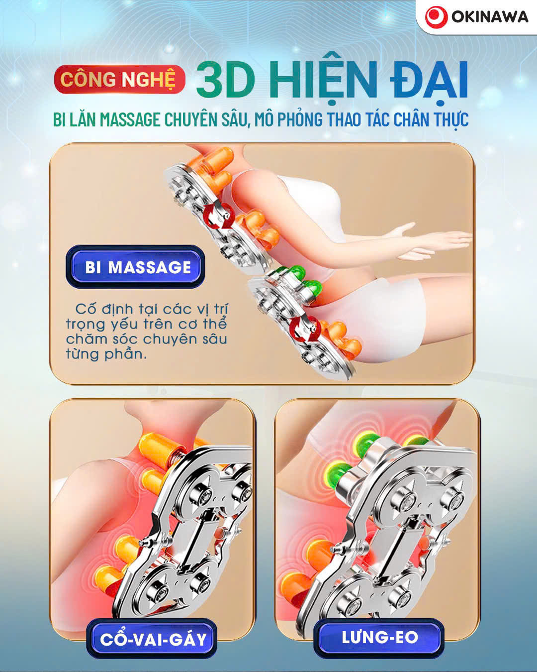 ✔ Liệu pháp massage chuyên sâu: Con lăn massage cao cấp êm ái với công nghệ 3D hiện đại, mô phỏng chính xác các động tác massage chuyên nghiệp, tác động đa điểm vào các huyệt đạo từ lưng đến mông, giải tỏa mọi căng thẳng, đau nhức.