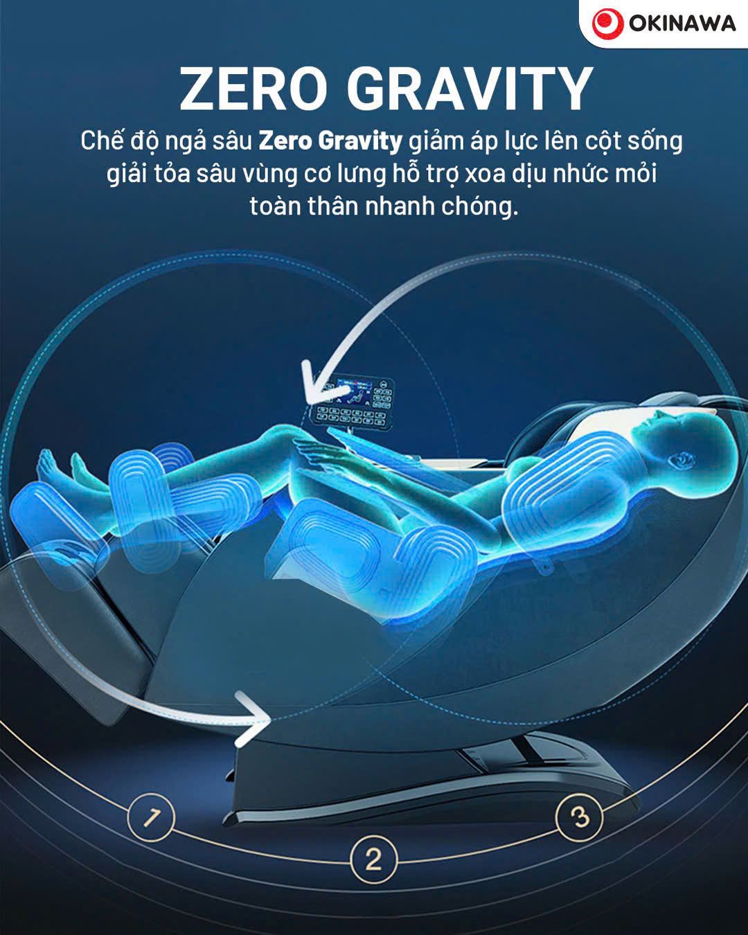 Zero Gravity – Lơ lửng giữa không trung, tận hưởng sự thư giãn tuyệt đối: Chế độ massage Zero Gravity trên Okinawa OS-165 được lấy cảm hứng từ tư thế của các phi hành gia trong môi trường không trọng lực ngoài vũ trụ. Khi kích hoạt chế độ này, ghế sẽ nhẹ nhàng ngả ra sau, nâng đỡ đôi chân bạn lên cao, tạo thành một góc nghiêng hoàn hảo, giúp giải phóng tối đa áp lực lên cột sống.
